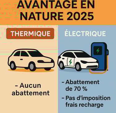 L’absence d’abattement, combinée à ces nouveaux pourcentages, rend l’utilisation de véhicules thermiques nettement moins attractive fiscalement, tant pour l’employeur (cotisations) que pour le salarié (impôt sur le revenu).
